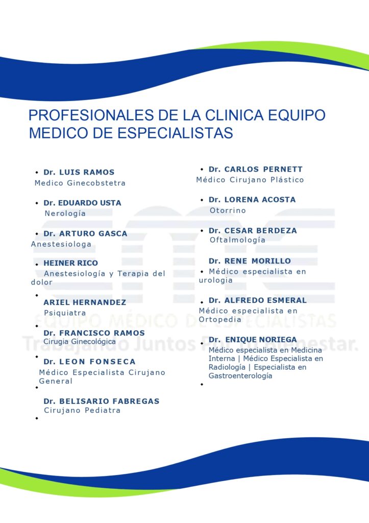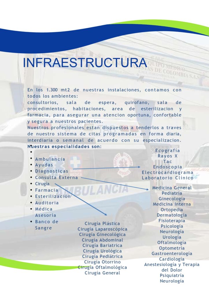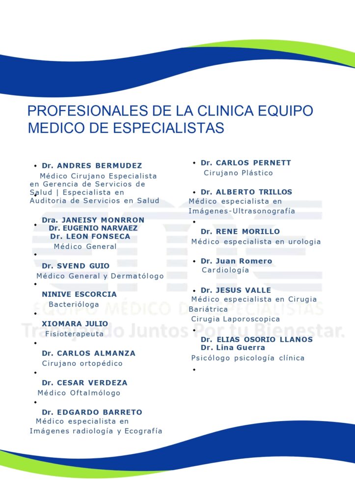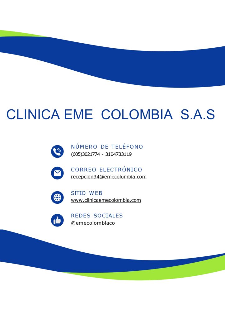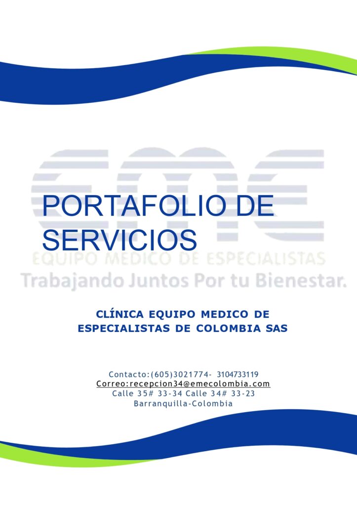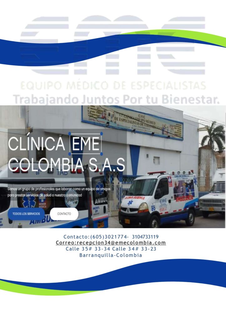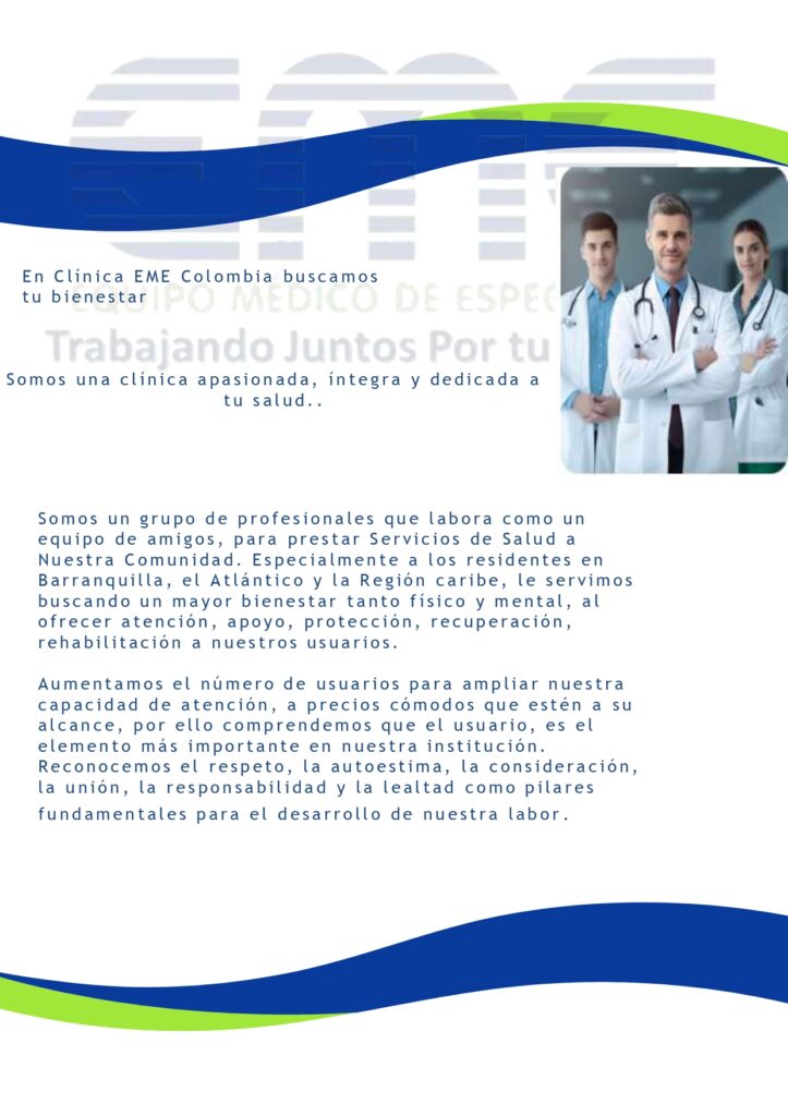 Clínica EME (Equipo Médico de Especialistas de Colombia S.A.S.) ofrece una atención integral en salud con múltiples especialidades, procedimientos quirúrgicos, ayudas diagnósticas y opciones de atención presencial, domiciliaria y virtual.