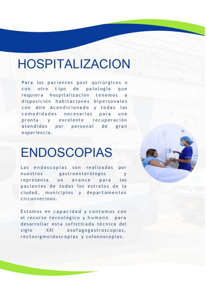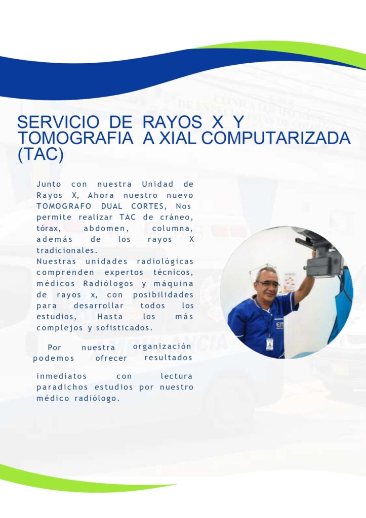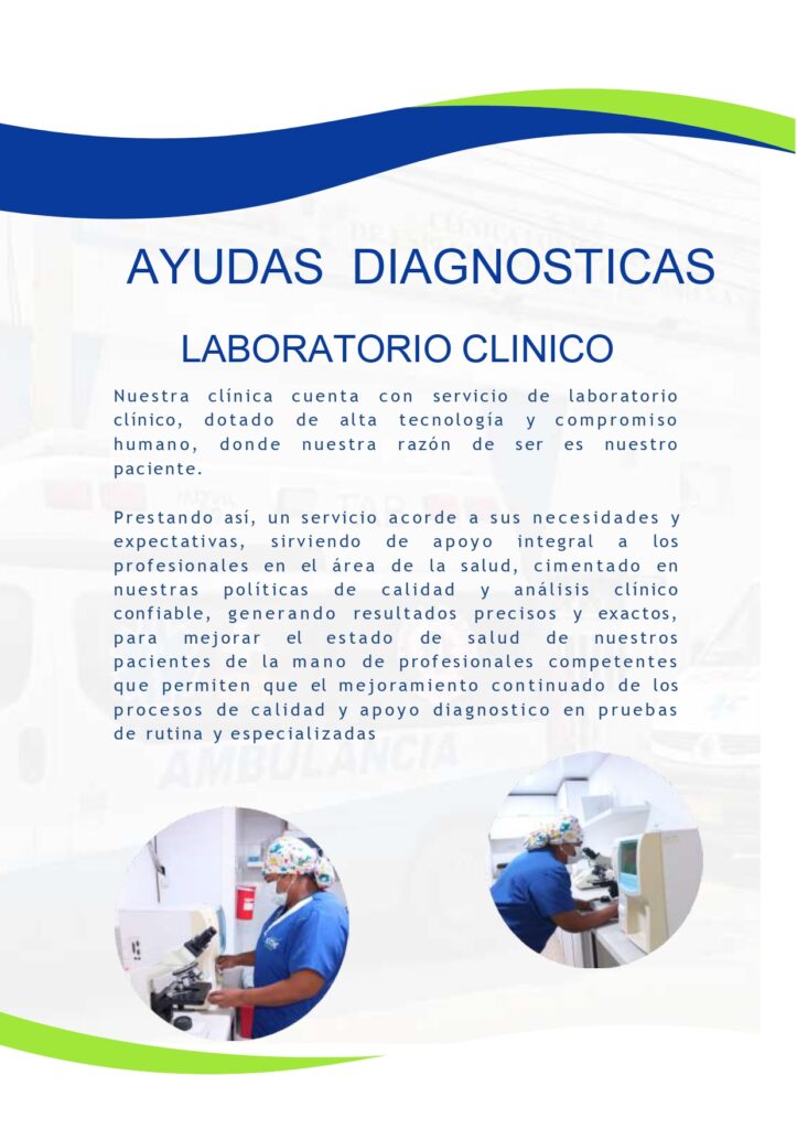 Ayudas diagnósticas: laboratorio clínico, electrocardiograma, rayos X, ecografías, TAC, video endoscopia y colonoscopia.