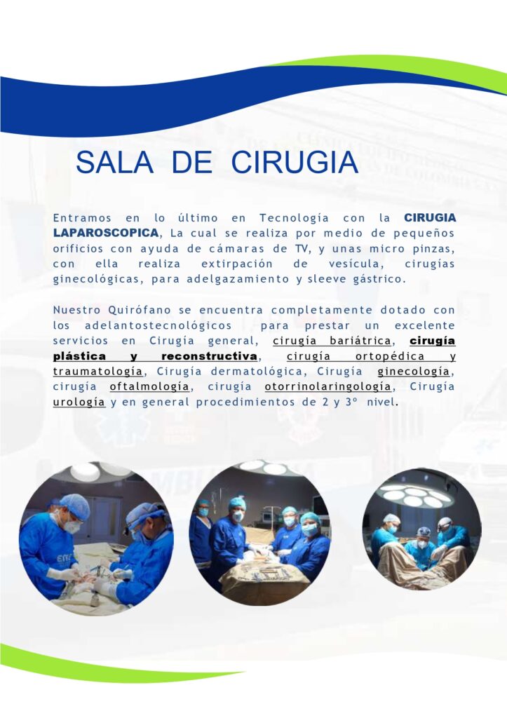 Procedimientos quirúrgicos: cirugía ortopédica, plástica (rinoplastia, blefaroplastia, lifting facial, mamoplastia de aumento), laparoscópica, ginecológica, bariátrica, urológica y oftalmológica.